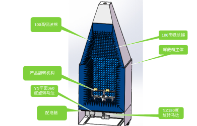 一般來說5G毫米波屏蔽暗室內部測試支架結構還包括 :夾具, 支架 轉臺 軸承固定床 電機 360同步帶旋轉 USB出線口 4個USB接口 電機